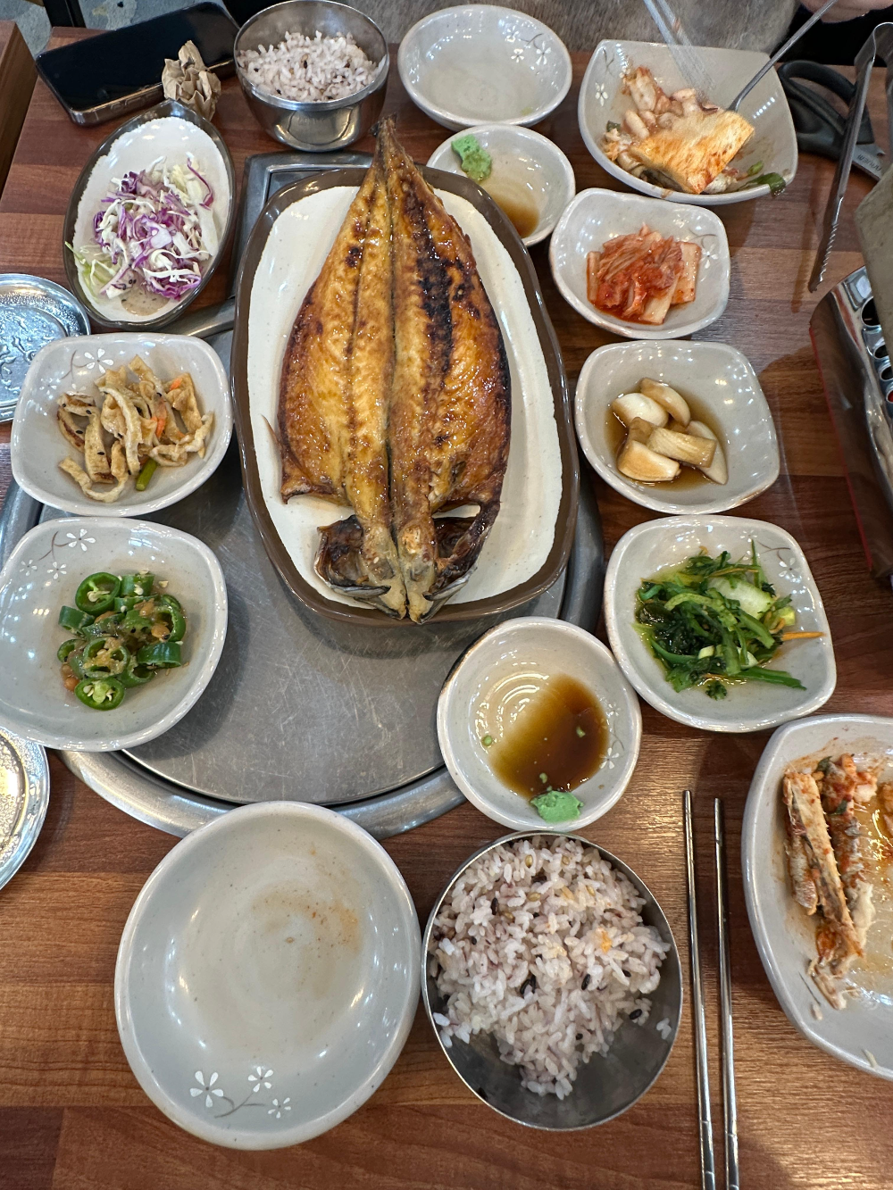통갈치조림은 통갈치 한 마리와 고등어구이로 구성되어 있어 둘이서 먹기에 충분한 양이었어요. 고등어구이도 노릇노릇하게 구워져 맛있었습니다. 주인공인양 등장하는 고등어는 진짜 정말 부드럽더라고요. 서울에서 자주 고등어구이를 먹는데,,,! 진짜 저리 가라더라고요? ㅎ